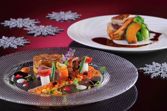 近畿大学附属農場で開発した、旨みたっぷりの合鴨肉「近大鴨」を使用し、北京ダック風にアレンジした料理などが楽しめる、クリスマス限定の贅沢なコースです。サンタクロースやツリーに見立てた野菜などを随所に散りばめ、見た目も華やかに仕上げました。