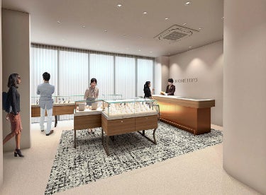 店内1階は大きな窓により視認性が高く、明るく、開放的な空間となり、ブランドバッグを中心に気軽に手に取って頂くことができるようになりました。2階は宝石、時計を中心に取り揃え、対面接客カウンターを設置することでスタッフと会話を楽しみながらお気に入りの商品をお選びいただけます。また、フィッティングルームを新設することで、衣料品の取り寄せ販売も可能となりました。