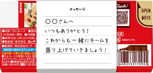 また、まずはロッテで取り組むべく、「勤労感謝week」と称し、11月18日(月)~11月22日(金)に、ガーナチョコレートと熨斗をセットにして社内で配布し、そこに社員が各々メッセージを書き、同僚や先輩・後輩などへ贈る取り組みを実施予定です。