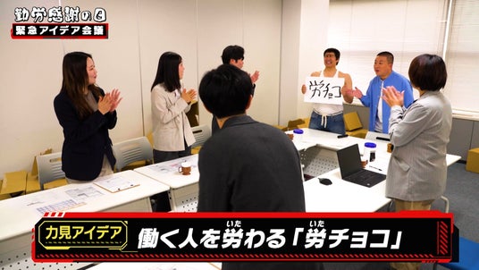 勤労感謝の日に向け、チョコレートで仕事仲間に感謝を伝えるべく、某日都内にてロッテの緊急アイデア会議に参加した松尾さん。相方の長田さんは休暇のため欠席…と思いきや、長田さんの代わりに助っ人として現れたのはバラエティ番組のコントに登場する「力見力」さん!アイデアを考えてきたという彼は会議室でも大暴れ!全力で力んだ末、「板チョコ」ならぬ「労チョコ(いたちょこ)」のアイデアが生まれました。