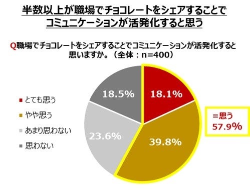ロッテの調査によると、勤労感謝の日に感謝の言葉を伝えるなどの行動をしている人はわずか1割で、ほとんど意識されていないことがわかりました。1週間以内に職場で労りの言葉をかけられた人も3割未満と、恒常的に“職場での労り”が不足している実態も明らかになりました。一方で、1つの解決策として、職場でチョコレートをシェアすることでコミュニケーションが活発化すると思うか聞いたところ、半数以上が思うと回答し、チョコレートがコミュニケーションの一助となる可能性も見えてきました。