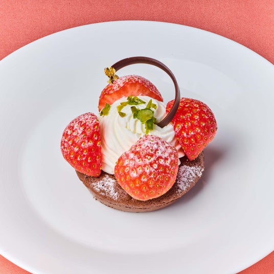 つやっと輝くドーム型のスイーツ「ショコラルージュ」はショコラサブレに、サクッと軽いジェノワーズ生地を重ね、いちごの香り高いジュレ、ホワイトチョコレートムースをとじ込めました。ほんのりピンクに色づいた「タルトフレーズフロマージュ」は、くちどけなめらかなチーズケーキにいちごの華やかな風味が相まって後をひくおいしさです。