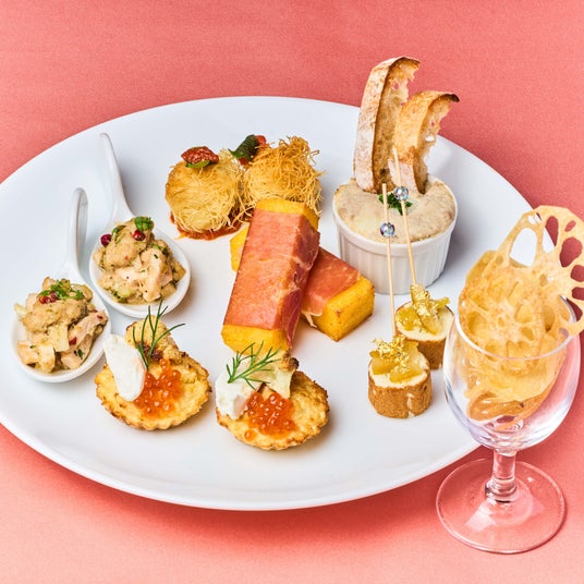 鱈の真子のブランダード、ポレンタの生ハム巻き、モッツァレラチーズとカダイフのボール、石川県産ゆずとクリームチーズのピンチョス、カリフラワーのタルト いくらとヨーグルトソース、能登豚のトンナート いしる風味、菊芋と加賀蓮根のチップス