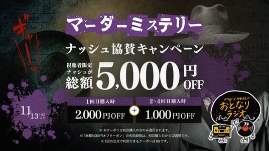 「世界中の人々が健康で豊かに生活できる未来を届ける。」をミッションに掲げ、手軽に美味しく栄養管理ができる冷凍宅配食サービス「nosh(ナッシュ)」を提供するナッシュ株式会社(本社:大阪市、代表取締役:田中 智也)は、「マーダーミステリー 2024 supported by nosh atagiゆゆうたのおとなりラジオSP」への冠協賛を記念し、「nosh」が総額5,000OFF(※)となるお得なキャンペーンを実施します。