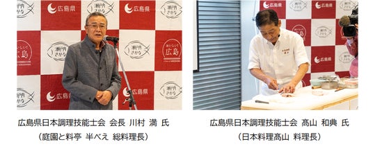 実証実験の競りに参加するこだわり漁師を代表して、江田島市鹿川漁協の内藤希誉志様と広島市漁協の岡野真悟様が獲った瀬戸内さかなを用い、日本料理高山の高山和典料理長による調理デモンストレーションを行いました。これにより、料理人と流通事業者が魚の質を学び深めるための研鑽会となりました。