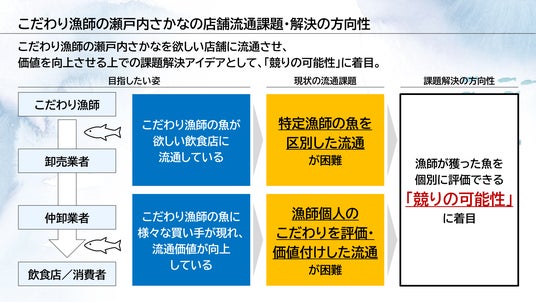 これまで、各地で競りを通じて水産物のブランド化が進められてきました。具体的には、特定の魚を選び、出荷基準や数量を守ることで価値を高めるという、魚そのものに焦点を当てた取り組みです。しかし、瀬戸内海では少量多品種の漁場であり、日々の漁獲量も一定ではないため、決まった数量を確保することが難しいのが現状です。こうした理由から、現行の競りに対応する流通モデルを維持することが困難です。