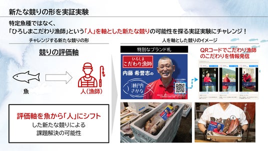 そこで本事業では、新たな競りの形として評価軸を特定の「魚」から「こだわり漁師」という「人」にシフトさせ、瀬戸内ならではの課題を解決する新たな競りモデルを提案します。具体的には、こだわり漁師の顔が見える特別なブランド札を導入し、人を中心とした競りを実証実験的に開催します。広島市卸売市場の荷受業者である広島魚市場株式会社様のご協力のもと、この新しい競りの形がもたらす可能性を探りながら、瀬戸内の漁師たちのこだわりを広く伝えてまいります。