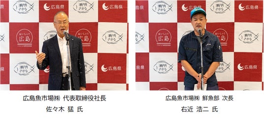 発表会では、広島魚市場株式会社様より代表取締役社長の佐々木様、競りを担当する鮮魚部次長の右近様にご登壇いただき、実証実験にかける意気込みを発表いただきました。