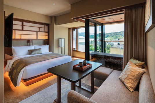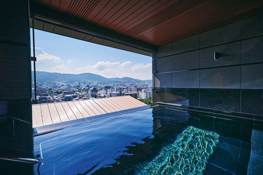 京都の中心部である四条河原町に、鴨川や東山を地上約31メートルから望むルーフトップ・ラウンジ「空庭テラス」と、最上階の天然自家源泉「天空露天風呂」をしつらえ、2つのスタイルを持つ和の温泉リゾートとして2022年に誕生。