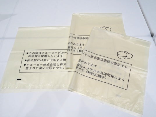 最近のトピックスとしては、株式会社ネクアス(福井県あわら市)との共同開発により、卵殻の消臭機能を生かしたごみ袋を試作しました。ごみの廃棄や回収で問題となる「臭い」を、卵殻が持つ消臭機能によって軽減できることが確認されています。この卵殻を配合したごみ袋の試作品は、2024年11月10日(日)に調布市主催で開催された多摩川河川敷の清掃活動「多摩川クリーン作戦」に提供しました。