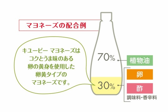 タマゴを使うだけではなく、長年研究を重ねてきたキユーピーグループマヨネーズ作りに欠かせない原料の一つがタマゴです。マヨネーズは主に「タマゴ」「酢」「植物油」からできています。「キユーピー マヨネーズ」は、タマゴの中でも、コクとうま味のある卵黄タイプのマヨネーズで、「キユーピー マヨネーズ」450gの中には、卵黄が3.6個も使われています。