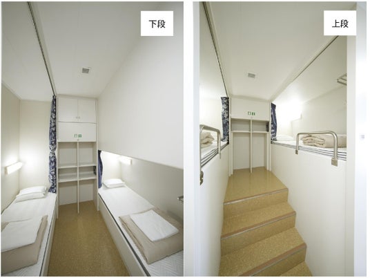 ツーリストA(相部屋)お一人様1ベッド。下段と上段が互い違いの入口になっているため、プライベート空間も確保。