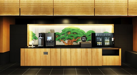 東急ステイ京都阪井座は明治期に「阪井座」という芝居小屋があった場所に位置し、松竹創業者・大谷竹次郎氏が興行主を務めたことから「松竹」創業の地とされています。このことからロビーラウンジのリニューアルに際し、松のモチーフをあしらった生地で、正面に老松を描いた歌舞伎の舞台装置「松羽目(まつばめ)」を描き、アートのように演出しました。