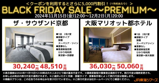 株式会社ジェイアール東海ツアーズ(本社:東京都中央区、以下JR東海ツアーズ)は、2024年11月15日(金)12時より、「BLACK FRIDAY SALE~PREMIUM~」を開催いたします。往復新幹線と記念日やご褒美旅行におすすめのラグジュアリーホテルや旅館がセットになったEX旅パックを、セール価格で予約できるチャンス!さらにEX会員情報にLINEを連携すると、BLACK FRIDAY SALE~PREMIUM~プラン限定で利用できる5,000円割引クーポンを配信しています。一年に一度のビッグセールで気になっていた憧れの宿をおトクに予約!このセールをお見逃しなく!