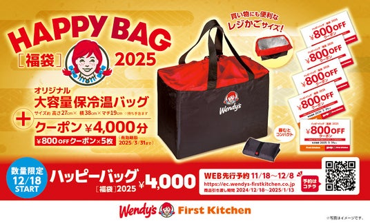 ウェンディーズ・ジャパン株式会社及び、ファーストキッチン株式会社 (所在地:東京都新宿区、代表取締役:紫関修) が展開する、ウェンディーズ・ ファーストキッチンとファーストキッチンでは、2024年12月18日(水)10時から、オリジナルの福袋を数量限定で販売します(競馬場店を除く)。福袋「ハッピーバッグ2025」(4,000円)は、オリジナルの大容量保冷温バッグに加え、販売価格と同額のクーポンがついた大変お得なセットとなっています。オリジナルの保冷温バッグはこの機会でしか手に入らない限定品で、ウェンディーズ・ファーストキッチンとファーストキッチンで異なるデザインをご用意しました。また11月18日(月)から12月8日(日)の期間でWEB先行予約を実施します。お得が詰まった「ハッピーバッグ2025」をぜひお買い求めください。