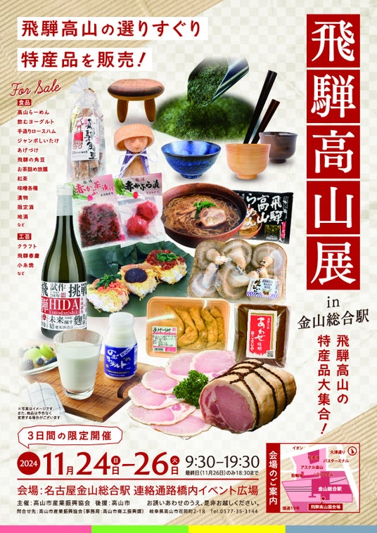 岐阜県高山市の地場産業の振興を目的に組織している「高山市産業振興協会」が、令和6年11月24日(日)から26日(火)までの3日間、愛知県名古屋市金山総合駅において、飛騨高山の物産販売のイベントを開催します。