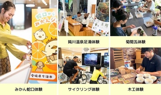 みかん蛇口体験・鈍川温泉足湯体験・菊間瓦ワークショップ・木工体験・サイクリングVR体験など、今治の魅力を体感してみては!?