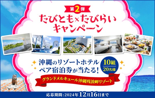 「たびとも×たびらいキャンペーン第2弾」では、予約対象期間中にたびとも&たびらいの2サイトに無料会員登録をし、利用対象期間にたびらいのサービスをご利用していただいた方の中から抽選で、沖縄の人気リゾートホテル「グランドメルキュール沖縄残波岬リゾート」1泊2日朝食付きペア宿泊券を10組20名様にプレゼントします。