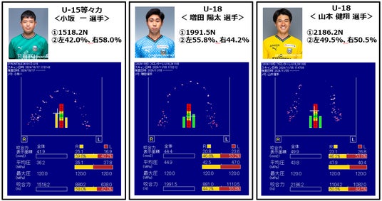 今回、講義だけではなく武田客員教授に噛むチカラ測定を行っていただきました。デンタルプレスケールIIという器具を使用して、選手たちの咬合力と左右バランスを測定。U-15等々力の小坂一選手は「噛むことは集中力を高めたり、脳を活性化させるという重要なことで、今までは意識したことがなかったです。また今回自分の噛むチカラ測定の結果を踏まえて、今後は意識していきたいと思いました」と語りました。U-18では山本健翔選手から「自分でも驚いているのですが、意外にも噛み合わせがよく噛む力が強かったのは自信になりました」、増田陽太選手は「セミナーを受けて、どんな時に活用できるかということを理解した上で、これからはトレーニングや食事の時に意識し、プレー中に発揮していければと思います」とそれぞれが語りました。