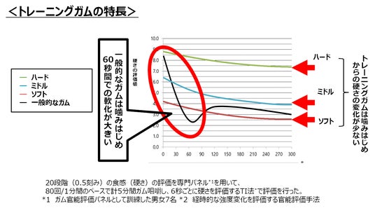 トレーニングガムは、「噛むこと」をトレーニングする目的で一定のリズムで噛み続けられるように特別に製造したガムです。このガムは硬さを選択し、自身の噛むチカラに合わせてトレーニングすることができます。