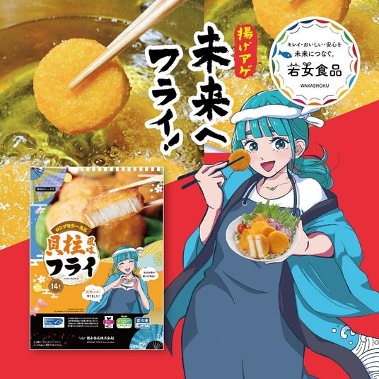 「MSC貝柱風味フライ」のパッケージデザインに、若女食品株式会社の公式キャラクターと調理例を載せた商品です。