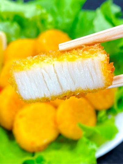 高級な食材である帆立の貝柱を模した風味かまぼこをフライ用にした商品です。