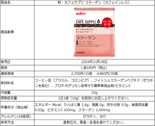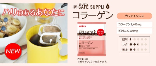 コーヒー・茶類等の通信販売事業を行う株式会社ブルックス(本社:神奈川県横浜市、代表取締役社長:小川裕子)は、健康応援コーヒー「カフェサプリシリーズ」からドリップバッグコーヒー「カフェサプリ コラーゲン」を2024年11月18日(月)より、リニューアル発売いたします。