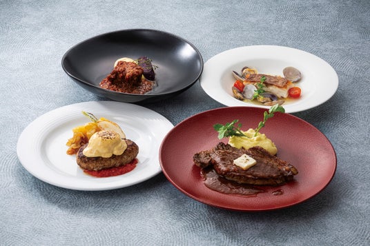 コース料理の前菜に出てくるようなクオリティーの高いタパスとパスタ&ピザ、サラダ、スープ&カレーはブッフェスタイルでお好きなだけお召しあがりいただき、メイン料理とデザートはコーススタイルで提供します。選べるメイン料理には東京の銘柄豚「TOKYO X」やビーフステーキも登場します。