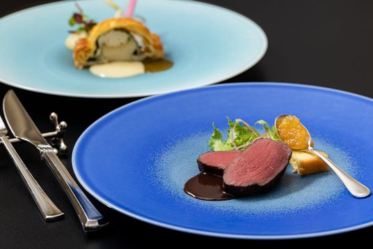 洋食のお肉料理は「伊豆産鹿ロース肉の低温調理、カシス風味の赤ワインソース、河津産柑橘のコンフィチュール」です。伊豆の山々で獲れた鹿肉は、程よく引き締まった赤身で自然の旨味が詰まっています。じっくりと火入れすることで、柔らかく癖のない仕上がりに。伊豆の柑橘を使用したコンフィチュールがアクセントとなり、自然の恵みを感じられる一皿です。