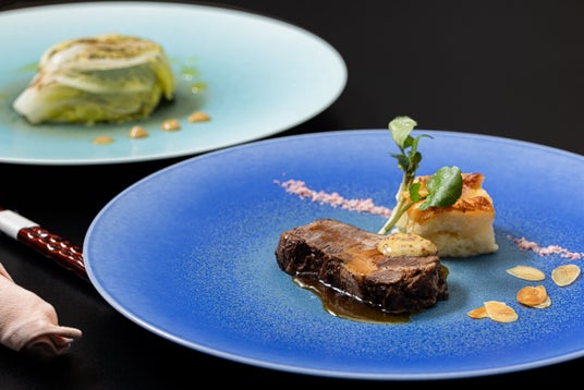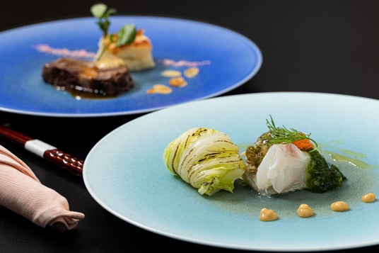 和食のお魚料理は「白身魚と白菜の博多仕立て 雲丹蟹味噌ソース」です。白身魚を昆布締めにし、昆布削りや青海苔ジュレと白菜などを重ねました。さっぱりとした白身魚と濃厚な雲丹蟹味噌ソースが良く合います。