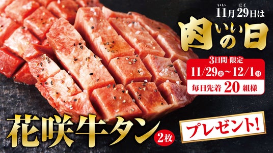 ワタミ株式会社(東京都大田区、以下ワタミ)が展開する「和牛焼肉 築地牛武」練馬店では、年に一度の「いい肉の日」を記念して、11月29日(金)~12月1日(日)の3日間限定で、特別メニュー「花咲牛タン」1皿(2枚)を毎日先着20名様にプレゼントいたします。