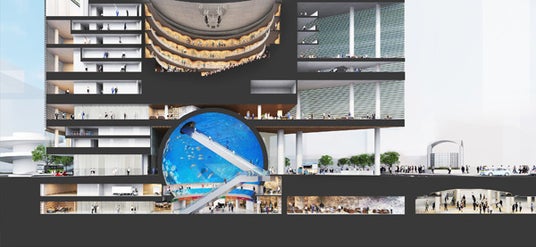 高層階から、展望スペースやミュージアム、ホテル、イノベーションオフィス、コンサートホール・舞台、商業施設、駐車場などで構成されます。