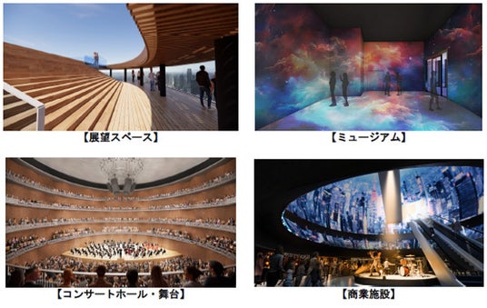 構成:展望スペース、ミュージアム、ホテル、イノベーションオフィス、コンサートホール・舞台、商業施設など