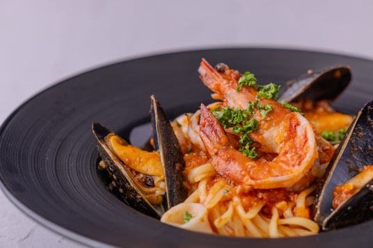 具材にエビ、ムール貝、あさり、イカを使用。魚介の風味とトマトソースのバランスが良い一品です。