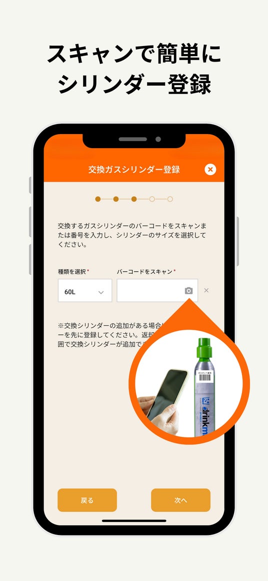 4.交換するガスシリンダーのサイズを選択し、スキャンまたは手入力で登録する