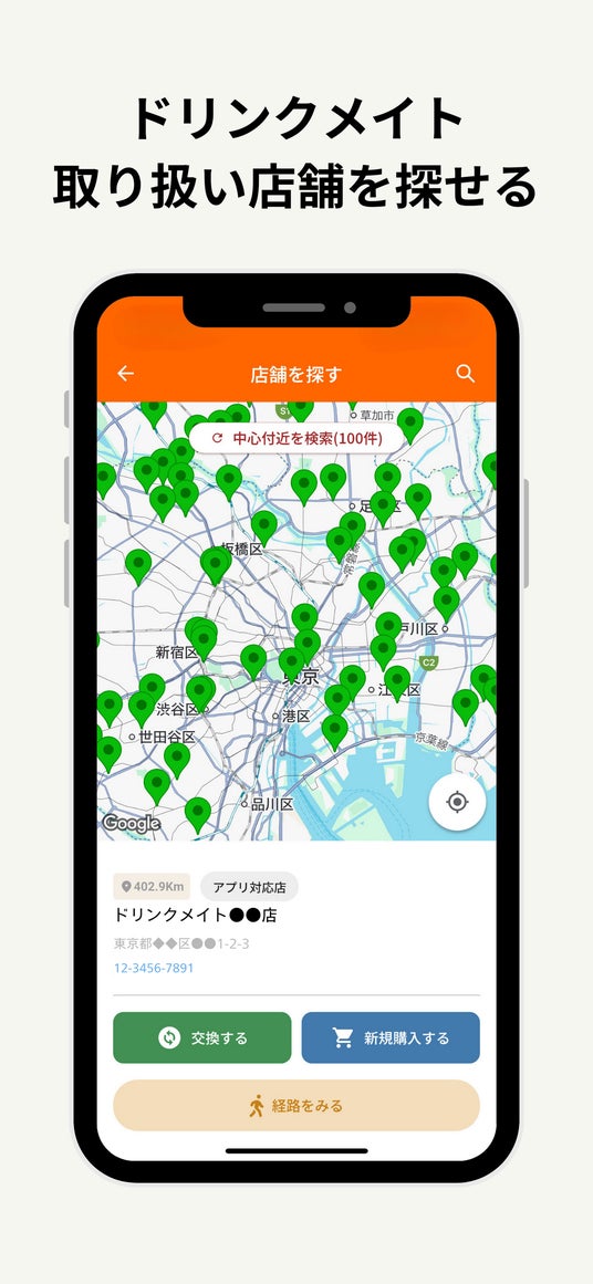 スマートフォンの位置情報をONにすると、現在地周辺のドリンクメイト取り扱い店舗が地図上に表示されます。キーワード検索の場合は、都道府県・アプリ対応店での絞り込み検索が可能。さらに店舗までの経路を確認することもできます。