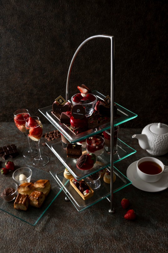 二段目にはビターチョコレートを使用したジュレ・オ・ショコラにいちごを使ったベリーソースを合わせたさっぱりとしたグラススイーツや、フレッシュないちごをたっぷりとのせたクレームダンジュ、濃厚なカカオの味わいが愉しめるVANILLABEANSのチョコレートケーキなどをのせました。