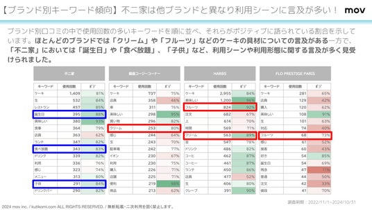 ほとんどのブランドでは「クリーム」や「フルーツ」などのケーキの具材についての言及がある一方で、「不二家」においては「誕生日」や「食べ放題」、「子供」など、利用シーンや利用形態に関する言及が多く見受けられました。