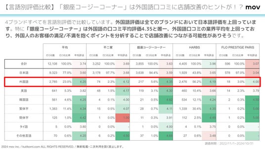 4ブランドすべてを言語別評価で比較しています。外国語評価は全てのブランドにおいて日本語評価を上回っています。