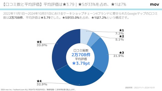 2022年11月1日~2024年10月31日におけるケーキショップチェーン4ブランドに寄せられたGoogleマップの口コミ数は2万708件、平均評価は★3.79でした。★5が33.0%を占め、★1は7.2%という構成です。