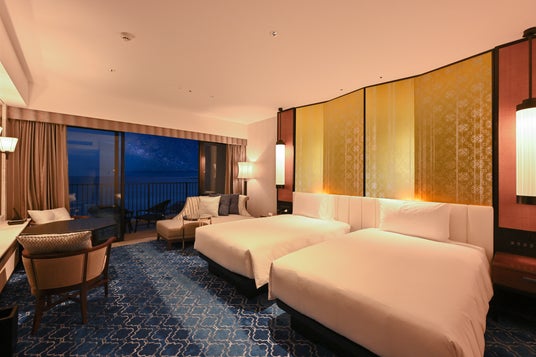 メインエリアのイルミネーションビューを楽しめる限定宿泊プランを販売しております。全室バルコニー付きの広々とした客室からは、昼間は目の前に広がる碧い海、そして日没後は夜空を彩る光のアートを綺麗にご覧いただけます。