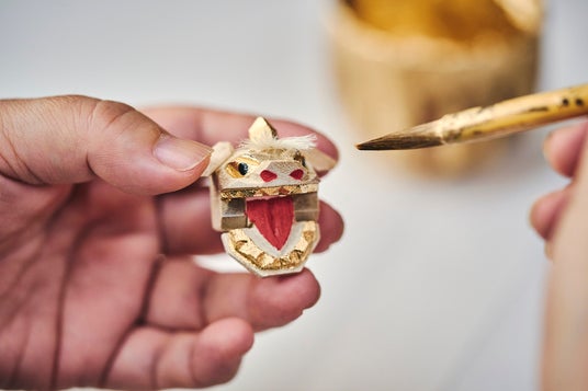 加賀獅子頭は悪事を一飲みすると言われており、魔よけ厄除けの守り神で縁起物です。工房では、加賀獅子頭ねつけを作成し、旅の思い出に笑福招来の小さな獅子頭を連れて帰ることができます。掌に収まる小さな加賀獅子頭ですが、ひとつひとつ知田工房の職人の手で彫られ、口の部分は大きな加賀獅子頭同様、パクパクと動く造りになっており本格的になっています。体験では、手彫りされた頭に目や口の絵付けを行い、耳や角、髪などのパーツや好みの色の紐をつけて、オリジナルの加賀獅子頭ねつけを作成できます。目の入れ方によってさまざまな表情を見せ、好みの顔に仕上げることができます。
