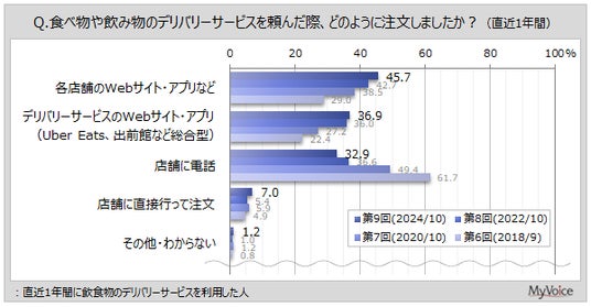 ■直近1年間に飲食物のデリバリーサービスを利用した人の注文方法は「店舗のWebサイト・アプリ」が約46%、「デリバリーのWebサイト・アプリ」が4割弱。「店舗に電話」は3割強で減少傾向
