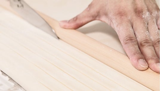 打ち棒で平らにした後、約3センチ幅に切ります。この後、打ち粉を振りながら手のひらで転がし、紐状にします。