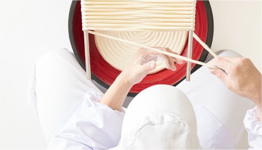 乾燥したうどんは竿からていねいにはずし、均一な長さに切ります 。