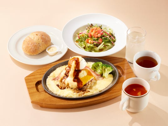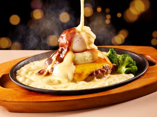 別添えのチーズソースとデミグラスソースをお客様の手でかけていただくことで、熱々の鉄板でぐつぐつとするソースや香り立つチーズをお楽しみいただける一品です。ココス自慢のジューシーな合い挽きハンバーグに、濃厚なチェダーチーズ、なめらかなマッシュポテト、こだわりのベーコン、半熟のゆで玉子を豪快にトッピングしました。
