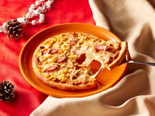 ミートソースベースのピッツァにソーセージやコーン、チーズ、マヨネーズをトッピングした、おこさまから大人まで楽しめる一皿です。
