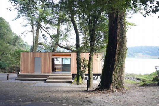 専用のデッキ空間を整備し、焚火やBBQを楽しめる環境を用意しています。 国立公園内、周辺との景観を大切にした造形を心がけています。外装は宮崎の杉の木をラフ面加工して活用しました。