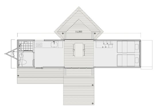 ベッドルームはロフト形式で上下2ベッドずつ配置。御池に向かって直交するデッキが特徴となっています。