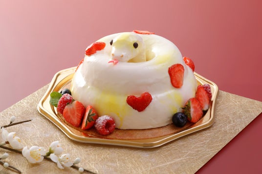2025年の干支「巳」にちなみ、クリームチーズをベースにいちごや柑橘類を合わせ、さっぱりとした味わいに仕上げたへび形のムースケーキをご用意しました。クリームチーズのムースの中に、上段はオレンジのムースと柑橘ゼリー、下段はフランボワーズのムースとベリーのゼリーを入れ、中央の穴の空いた部分にいちごなどのフルーツを入れて仕上げました。ご家族やご親戚が集まる新年の食卓に、お正月の手土産におすすめのスイーツです。